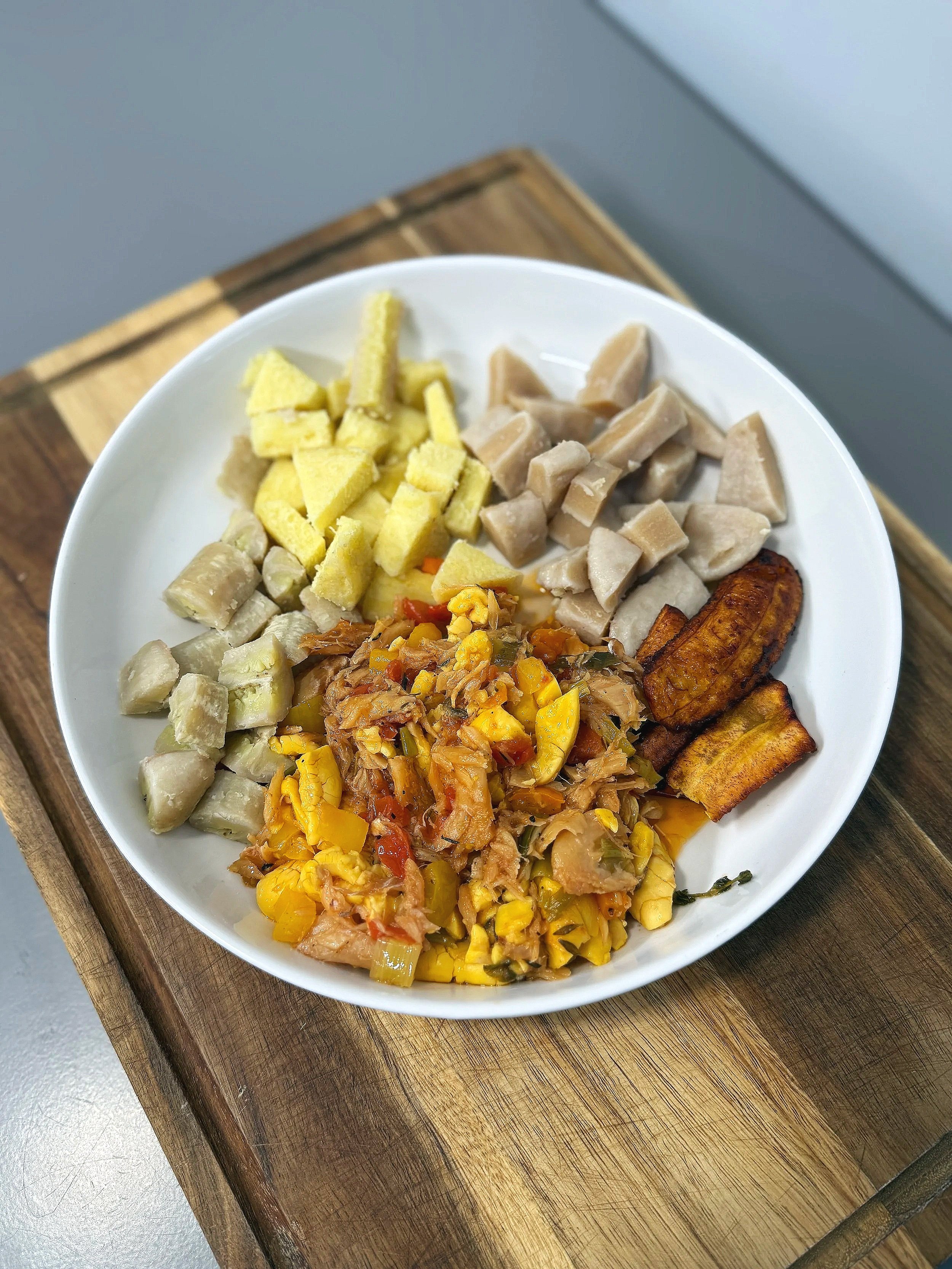 Serve: Plate the ackee and saltfish alongside the boiled dumplings, yam, banana, and fried plantain.