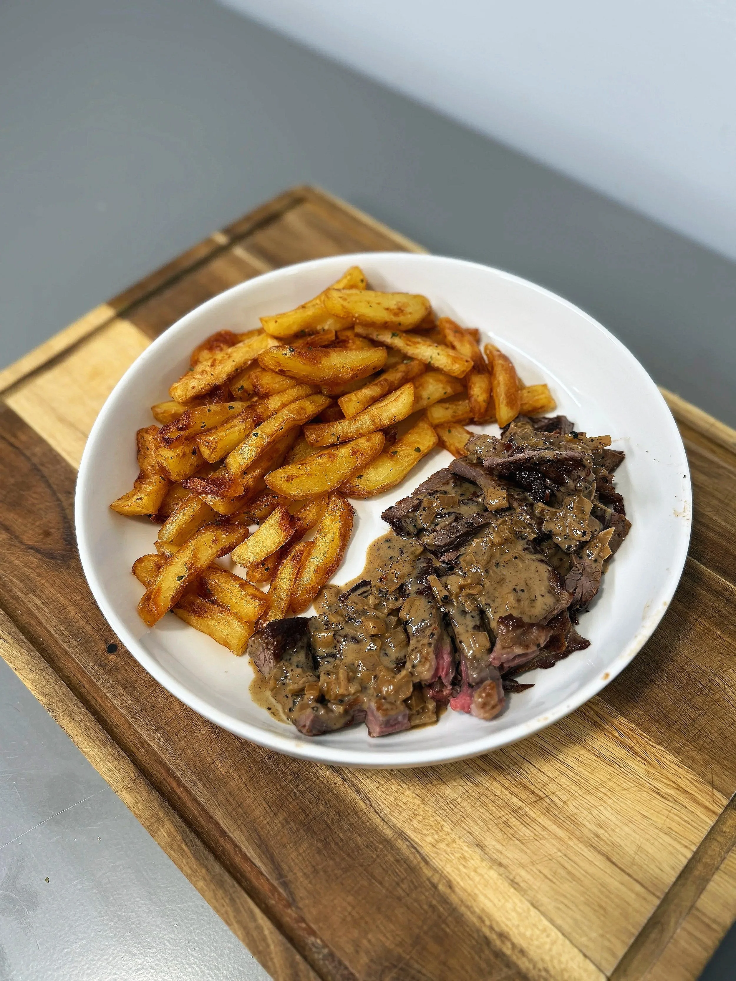 Serve: Slice the steak against the grain and serve with the hot fries and peppercorn sauce.